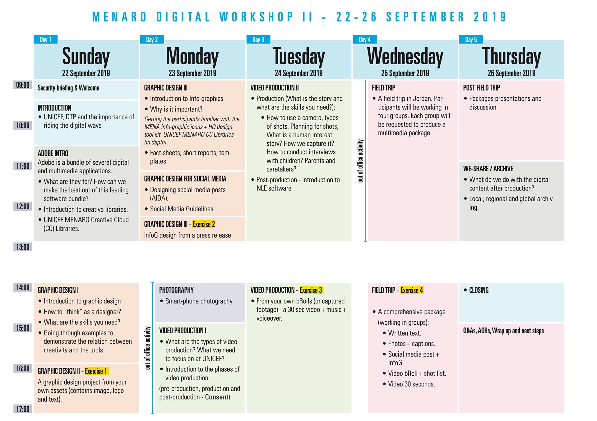 For instance, a detailed agenda from one of my one week workshops in September 2019 shows a robust curriculum covering essential topics like graphic design, video production, and smartphone photography. I leveraged top-tier tools such as Adobe Creative Cloud to provide an introduction to professional-standard creative technologies and techniques. The workshop format combined theoretical overviews with hands-on exercises in the field, including creating infographics, producing short videos from the captured footage, and designing social media posts aimed to engage and inform.